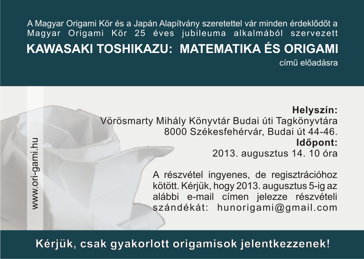 A Magyar Origami Kör a Japán alapítvány támogatásával a Kör 25 éves jubileuma alkalmából speciális workshopot szervez matematika és origami témakörben.